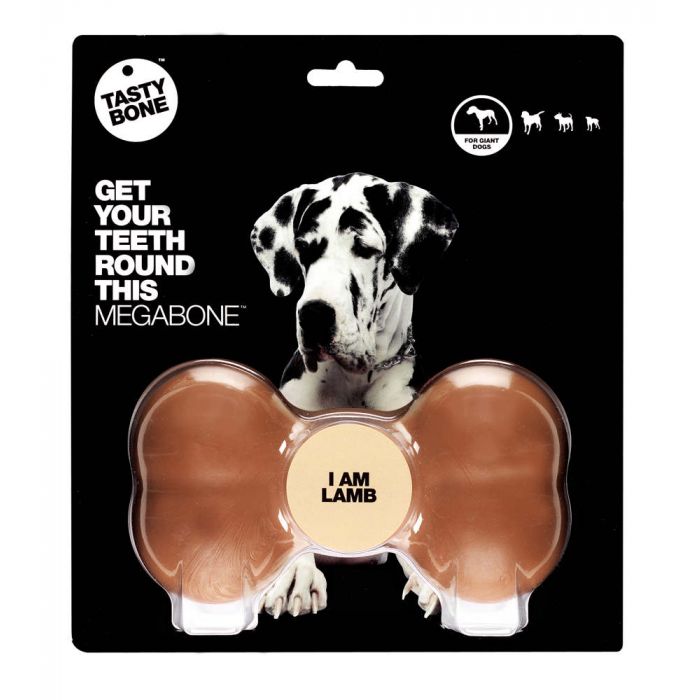 Tasty Mega Bone es un juguete recomendado para perros de tamaño grande y gigante. Está fabricado con nylon de textura dura para garantizar un juguete resistente y duradero. El hueso tiene un irresistible aroma a cordero para que resulte aún más atractivo para la mascota. Con este juguete el perro pasará horas entretenido. Además podrá fortalecer sus dientes y prevenir infecciones bucales mientras juega. Aunque no es un hueso comestible, si la mascota llega a ingerir algún trozo podrá digerirlo sin ocasionarle daños. Se recomienda sustituirlo por uno nuevo cuando el tamaño del hueso sea tan pequeño que pueda tragarlo entero.